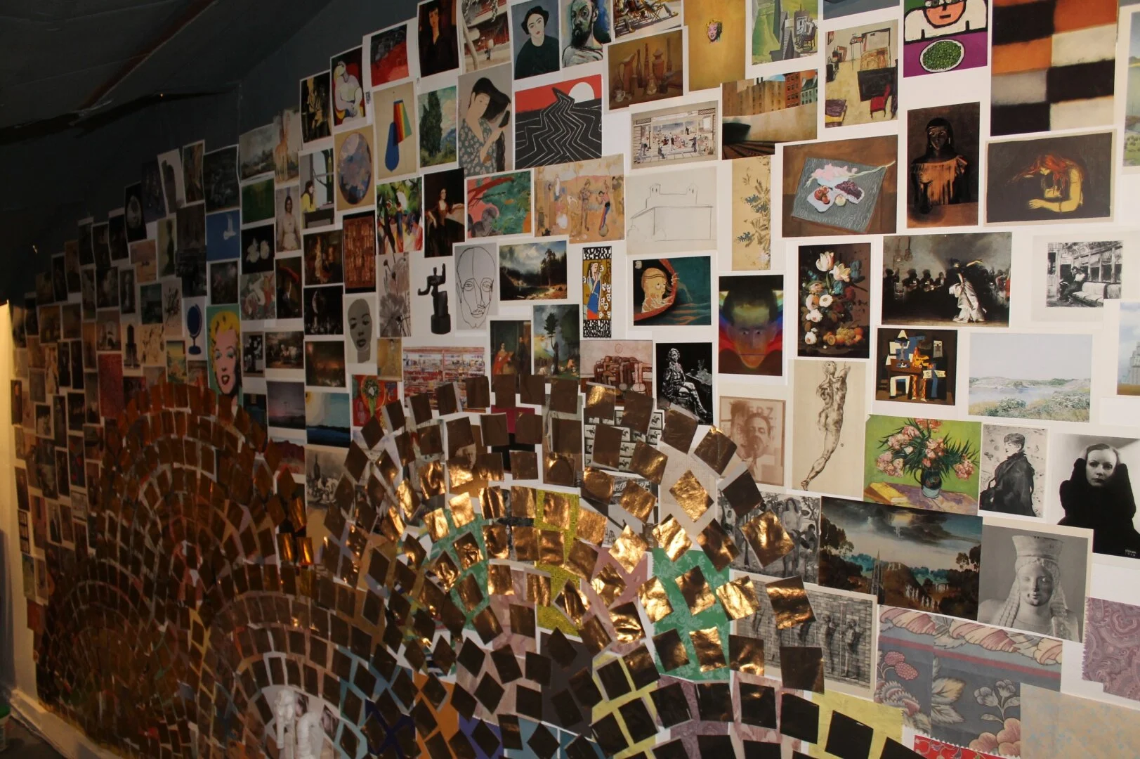 Jessica Cebra transforms the gallery space into a fantastical constructed cave, obsessively plastered with imagery drawn from the artist's personal museum souvenir postcard collection. Inside the cave, the legacy and stability of institutionalized narratives of art history are distorted and embellished to obscurity, covered in paper mosaic and collage – a fabricated shrine to impermanence. Fascinated by how history and collective memory are shaped by the ways we collect, preserve and present cultural artifacts, Cebra has explored notions of impermanence, growth and decay by appropriating and manipulating imagery of man-made iconic idealizations, monumentality, and opulent materiality in the face of larger natural forces.