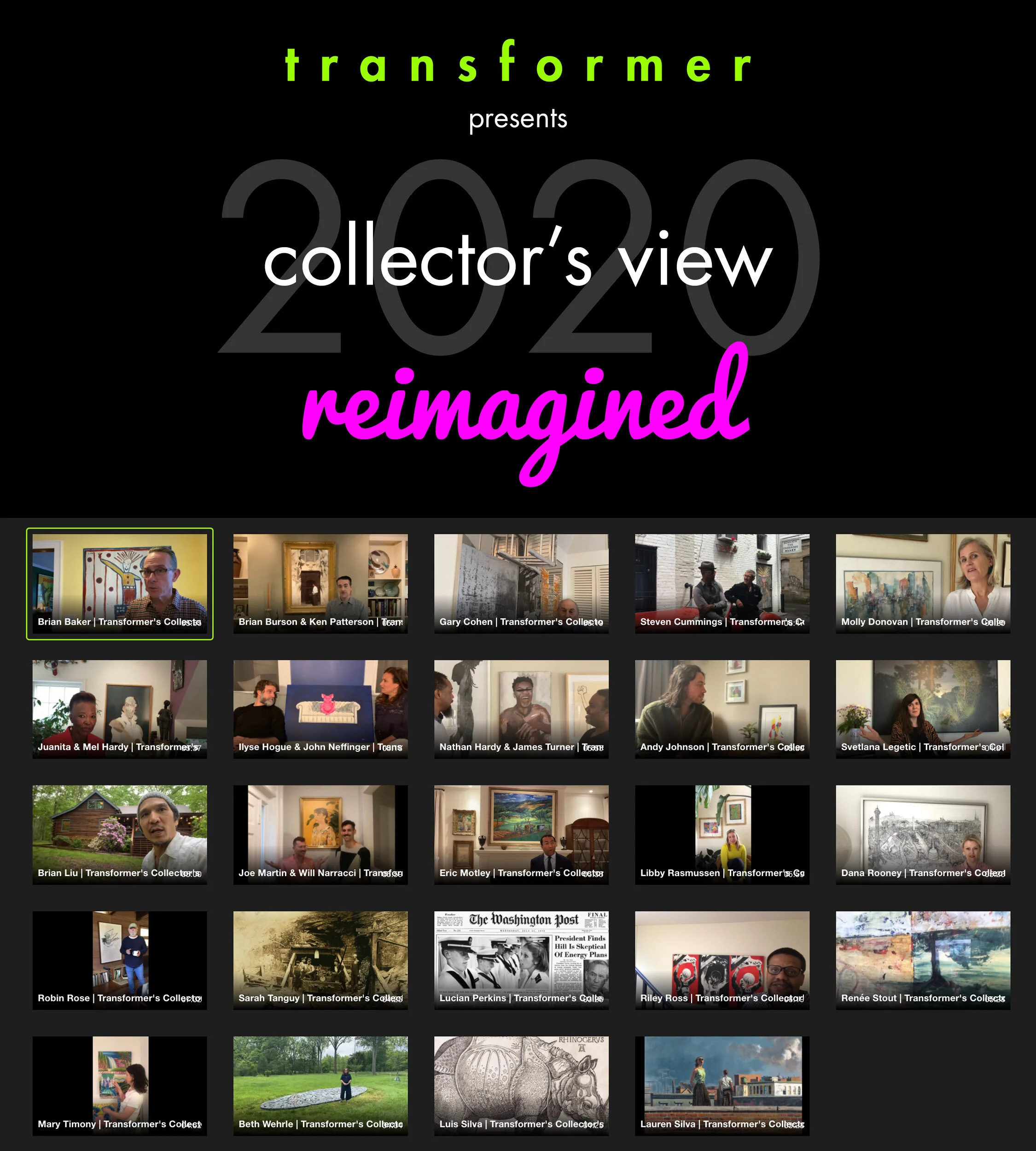 Transformer's 13th annual Collector’s View series offers a response to the COVID-19 pandemic, reimagining this year’s series as short, self-filmed videos (approx. 5 minute each), provided by an eclectic mix of invited collector Hosts.