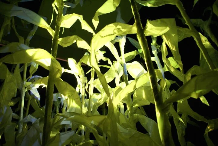 Manifesting a life-size, fabricated cornfield within Transformer's project space, audiences were invited to consider uses and preservation of natural resources. Cornfield was a visual work consisting of a wall-to-wall field of seven-foot tall, sculpted corn stalks made of painted wood, wire and visqueen, along with projections and a surrounding soundscape.