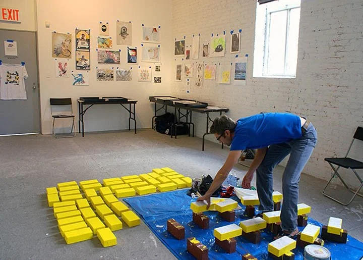 Geoffrey works on his brick project in Transformer's booth at No Soul for Sale. Transformer's installation of FlatFile works can be seen in the background.